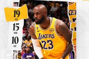 賽后湖人官方發(fā)布詹姆斯本場數(shù)據(jù)海報,本場比賽詹姆斯背靠背出戰(zhàn)并砍下三雙。