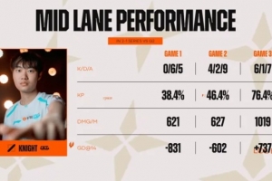體育資訊3月23日訊 英文流分享一組數據,前三局比賽中knight在前兩局前14分鐘經濟分別落后831和602,僅第三局前期領先。