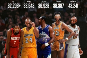 排在榜單下一位的是科比·布萊恩特,他領先杜蘭特1349分。由于常規賽只剩下12場比賽,這一壯舉不得不等到下個賽季。