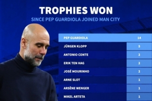自瓜迪奧拉加入曼城以來(lái),英超俱樂(lè)部贏得獎(jiǎng)杯數(shù)據(jù)排名: