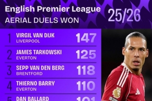 體育資訊3月24日訊 Squawka統(tǒng)計了本賽季球員在英超的爭頂成功次數(shù),并列出榜單,范戴克147次居首,并且他的成功率為75.77%,爭頂100+球員中最高。