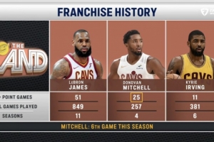 據(jù)統(tǒng)計,這是米切爾本賽季第6場40+,騎士生涯第25場,隊史第二,僅次于詹姆斯的51場。