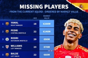 體育資訊11月16日訊 德國轉會市場統計了無緣本期西班牙隊球員身價,并列出榜單,亞馬爾2億歐居首。