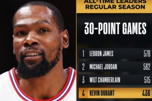 據(jù)統(tǒng)計(jì),這是杜蘭特生涯第436場(chǎng)單場(chǎng)30+,超越卡爾·馬龍,上升至NBA歷史第四位,僅次于詹姆斯、喬丹和張伯倫。