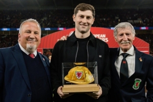 體育資訊3月28日訊 威爾士隊向本·戴維斯頒發“金色帽子”,表彰他達成威爾士隊出戰100場里程碑。