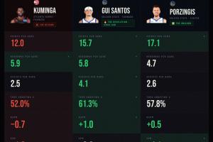 庫明加場均12.0分5.9籃板2.5助攻,真實命中率52.0%、相對正負值-0.7、估計正負值-1.8,這6項數據中只有籃板比桑托斯和波津多;