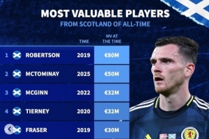 體育資訊11月16日訊 德轉(zhuǎn)統(tǒng)計蘇格蘭球員歷史身價排行榜,2019年羅伯遜8000萬歐居首,今年麥克托米奈5000萬歐第二。