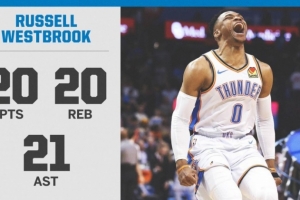 至此,威少成為NBA上第二位單場比賽打出20+20+20超級三雙的球員,第一位是1968年2月4日的張伯倫(22分25籃板21助攻)。