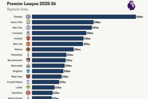 切爾西在本賽季支付了6510萬英鎊的經(jīng)紀人費用,連續(xù)第三個賽季領跑俱樂部榜單。2025-26賽季,切爾西占到了英格蘭足球聯(lián)賽92家俱樂部經(jīng)紀人總支出的12%。