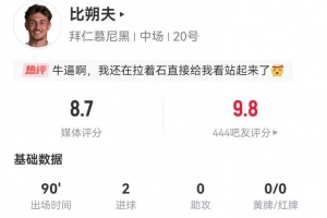 體育資訊4月4日訊 拜仁在本輪德甲3-2逆轉(zhuǎn)弗賴堡,比朔夫本場(chǎng)數(shù)據(jù)如下: