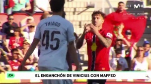 隨后Movistar的鏡頭捕捉到馬菲奧用手向維尼修斯比劃著球的手勢,還喊出了“沙灘”的詞匯,此前西班牙的多座體育場都曾響起過針對維尼修斯的這條口號。