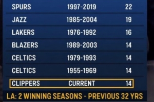 快船在隊(duì)史的前32個(gè)賽季,只有2個(gè)賽季是勝率超5成的