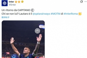 他也在今日被俱樂部官方評選為本場比賽的隊內(nèi)MVP。國米官方也點評道:“隊長回歸!除了他還能是誰呢?勞塔羅當選國米vs羅馬的隊內(nèi)MVP。”
