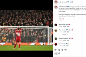 羅伯遜曬出自己向安菲爾德的謝場(chǎng)照,并表示:“告別這家俱樂(lè)部和球迷們將是我人生中最艱難的決定之一。但此后將會(huì)有那么一個(gè)時(shí)刻,讓我好好回顧并感受一切——那就是五月份。”