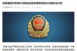 體育資訊04月10日訊 廣州市公安局越秀分局今日發布警情通報,針對此前全紅嬋被網暴事件,對多次發表侮辱性言論的徐某,作出行政拘留10日并處罰款的處罰。
