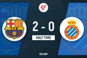 上半場補時3分鐘,巴薩2-0西班牙人。