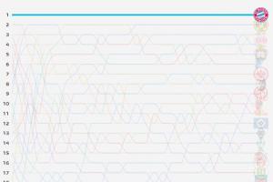 數(shù)據(jù)機(jī)構(gòu)Football Meets Data曬出了本賽季德甲排名的走勢(shì)圖,拜仁從首輪6-0萊比錫開始,一直穩(wěn)坐榜首。相比之下其余17支的球隊(duì)的排名則不斷上下變動(dòng)。