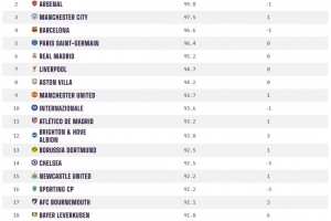 體育資訊4月13日訊 著名數據機構OPTA對全球超過10000家俱樂部打造了一個評分系統,評分范圍從0到100。其中,0分代表全球最弱的球隊,而100分則代表全球最強的球隊。在OPTA全球俱樂部實力榜中,拜仁、阿森納、曼城、巴薩以及巴黎圣日耳曼位居前五。
