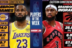 體育資訊4月14日訊 今日NBA官方宣布,湖人球星勒布朗·詹姆斯和猛龍球星布蘭登·英格拉姆分別被評為本賽季第25周西部和東部周最佳球員。