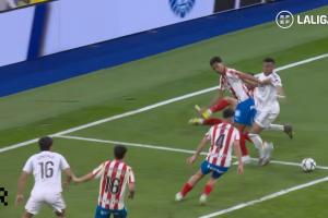首先來到馬德里,圣地亞哥?伯納烏球場,赫羅納禁區(qū)內(nèi)出現(xiàn)一次極具爭議的攻防。皇馬進攻球員完成變向擺脫后,在禁區(qū)內(nèi)與赫羅納防守球員發(fā)生身體對抗,皇馬球員試圖繼續(xù)持球向球門推進。此時雙方球員產(chǎn)生肢體接觸:一方面防守球員手臂碰到了前鋒面部,另一方面幾乎同時,防守方又碰到了進攻球員的支撐腿。所有接觸均源于此次對抗本身的動態(tài)與慣性,最終導致進攻球員倒地。主裁站位合理、視線清晰,判定比賽繼續(xù)進行。