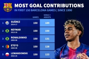 體育資訊4月15日訊 巴薩在本輪歐冠客場2-1擊敗馬競、總比分2-3出局。亞馬爾在本場比賽迎來個人歐冠生涯150場并取得進球,也躋身巴薩隊史同期直接參與進球榜前十。