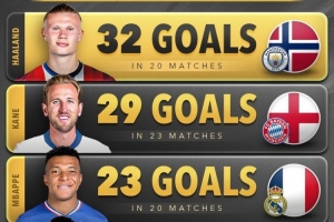 體育資訊11月17日訊 Score90統(tǒng)計了本賽季五大聯(lián)賽球員俱樂部+國家隊的進球數(shù)量,并列出榜單,哈蘭德32球居首,凱恩、姆巴佩二三位。