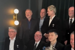 晚宴過程中,趙心童與亨德利、達(dá)赫迪、羅伯遜、墨菲、賓漢姆、戴維斯、泰勒、帕洛特、艾伯頓等世界冠軍合影留念。