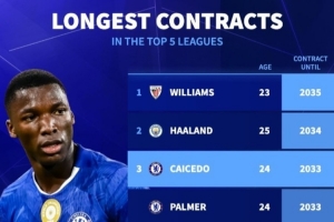 體育資訊4月17日訊 切爾西已經官宣同凱塞多續約至2033年,《轉會市場》統計顯示他也并列當前合同最長球員第三位。