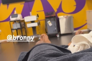 詹姆斯曬出他和兒子布朗尼都早早(洛杉磯時間早上8點40點左右)來到湖人訓練館的理療師接受理療并準備參加訓練的自拍畫面,并寫道:“早起的鳥兒??有蟲??吃!@布朗尼”