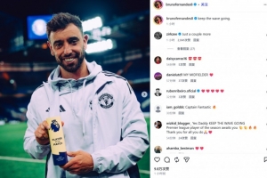 B費也在賽后通過社媒曬出自己手捧英超官方全場MVP獎杯的照片,并配文:“繼續(xù)保持當(dāng)前的勢頭!”