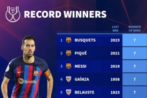 體育資訊4月19日訊 德國轉會市場統計了球員國王杯奪冠次數,并列出榜單,布斯克茨、皮克、梅西等5名球員7冠居首,前10名中,有8名球員在巴薩奪得過國王杯冠軍。