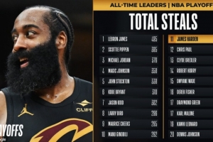 這樣一來,哈登生涯季后賽至今已經(jīng)送出288次搶斷,超越克里斯·保羅(287次),升至季后賽歷史第11位!