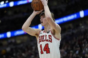 公牛球員布澤利斯上半場表現不錯,三分線外百發百中,沖搶籃板也還是很積極。