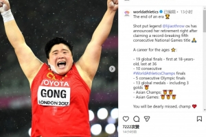 鉛球傳奇鞏立姣在贏得創紀錄的全運會五連冠后宣布退役??