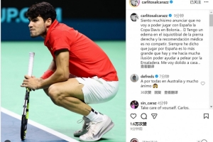 體育資訊11月18日訊 阿爾卡拉斯更新社媒動態,談到了自己因傷退出戴維斯杯決賽階段比賽的話題。