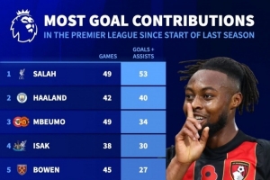體育資訊11月18日訊 德國轉會市場統計了上賽季至今球員在英超參與進球的數量,并列出榜單,薩拉赫53球居首,哈蘭德40球次席,姆伯莫34球第三。
