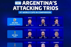 2018(16強)——梅西(1球2助)、阿圭羅(2球)、迪馬利亞(1球)