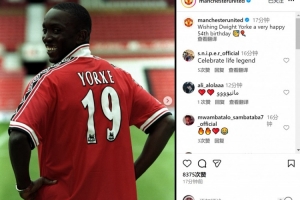 曼聯官方社媒曬出約克身穿本隊球衣的照片,配文:“祝德懷特-約克54歲生日快樂。”