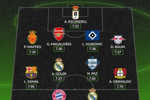 體育資訊11月19日訊 WhoScored根據球員的場均評分,列出了本賽季至今五大聯賽最佳陣容,姆巴佩、凱恩、亞馬爾在列。