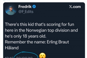 2018年9月23日,記者Fredrik在社交媒體上寫道:“挪威頂級聯賽有一個少年,進球如同探囊取物,而他只有18歲。請記住這個名字——埃爾林·布賴于特-哈蘭德。”