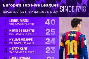 體育資訊11月19日訊 Squawka統計了2017-2018賽季以來球員在五大聯賽禁區外遠射的進球數量,并列出榜單,梅西40球居首,德布勞內25球次席。