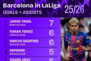 體育資訊11月3日訊 據Squawka統計,巴薩本賽季5名球員聯賽參與進球5+,五大聯賽首隊。
