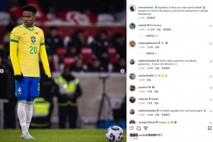埃斯特旺也在社媒曬出本場照片,配文寫道:“為每一次機(jī)會(huì)感謝上帝,能夠代表巴西國家隊(duì)出戰(zhàn)一直是一份榮譽(yù)!”