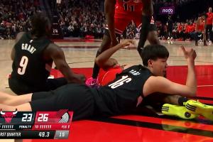 GIF-楊瀚森跟對(duì)手搶球!右手示意裁判快吹快吹!