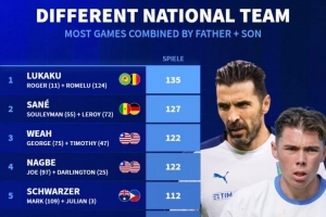 體育資訊11月20日訊 德國轉(zhuǎn)會(huì)市場統(tǒng)計(jì)了足壇父子代表不同國家隊(duì)的出場次數(shù),并列出榜單,布馮兒子路易斯·布馮一周之內(nèi)在捷克U19青年隊(duì)兩次戴帽,有望入選捷克成年隊(duì),因此德轉(zhuǎn)也提前將布馮父子列入榜單。