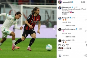 本場比賽40歲莫德里奇首發打滿全場,他也在社媒曬出本場與迪巴拉對抗照片,配文寫道:“團隊取得偉大勝利!讓我們攜手前進!加油米蘭!”