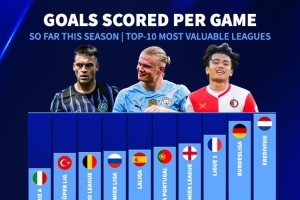 體育資訊11月20日訊 德國轉會市場統計了歐洲總身價前10聯賽的場均進球數量,并列出榜單,荷甲3.36球居首,德甲、法甲二三位、意甲2.22球墊底。