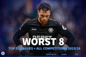 體育資訊11月21日訊 五大聯賽即將重燃戰火,《轉會市場》統計了本賽季至今五大聯賽球隊的各項賽事場均拿分最少情況,英超的狼隊以場均0.57分墊底。