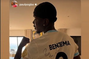 博格巴社媒曬照,他身穿本澤馬簽名球衣,并@本澤馬,而后者也轉發了這一動態。