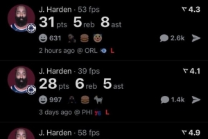 過去四場比賽,哈登都砍下了25+5+5的數據,據數據媒體Real Sports,36歲87天的哈登是達成這一成就的最老后衛。